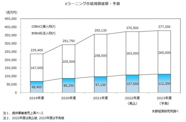 BtoC市場は、コロナ禍の沈静化によって全般的に需要の落ち着きが想定されるものの、学習ツールとしてeラーニングの一般化が進んでいることや、学習塾を中心に講師・指導者の人的リソースをeラーニングでカバーする需要は引き続き堅調な推移が考えられること、働き方がリモートワークに代わったことで生じた余暇時間を学習にあてる社会人の増加が一般的にもみられていること、eラーニングを組み込んだ学習サービスの増加によってサービスの多様化が進行していることなどを受けて、微増ながらも拡大を予測する。