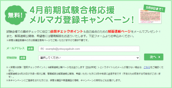 無料プレゼントの対象になるのは、 4月6日から5月9日の間に保育士講座のホームページからメールアドレスを登録された方です。解答速報は、登録時のメールアドレスに公開ページをお送りさせていただきます。