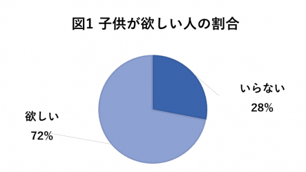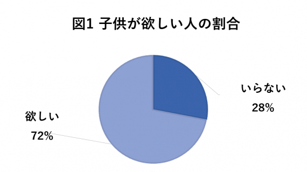 子供は欲しいと思うかどうかについて調査したところ、「欲しい」と回答した人は72%、「いらない」と回答した人は28%だということがわかりました。