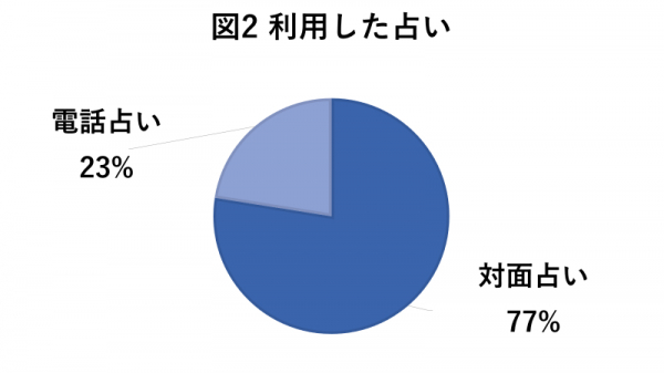 対面占いと電話占いどちらを利用したかという問いに対し、「対面占い」が77%、「電話占い」ついては23%の方が選択されていました。