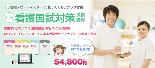 看護師になるために専門学校や大学で学んだ人が受験する「看護師国家試験」の合格に向けて、ポイントとなる知識を確認しつつ、過去問題演習などをスムーズに行えるようにするための通信講座です。