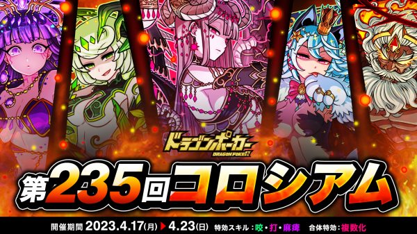 株式会社アソビズム(本社:東京都千代田区、代表取締役:大手智之)は、App Store・Google Playにて好評配信中のリアルタイム合体カードバトル『ドラゴンポーカー』で、2023年4月17日(月)より「第235回コロシアム本戦」を開催いたします。