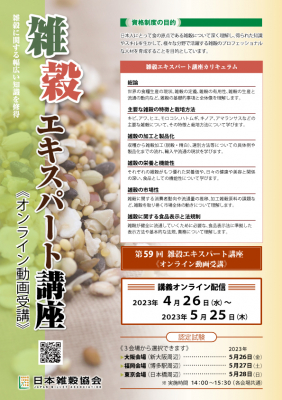 雑穀の普及に取り組む、一般社団法人日本雑穀協会(会長/倉内伸幸 日本大学生物資源科学部 教授)は、雑穀に携わる人材の育成を目的とした、第59回雑穀エキスパート講座《オンライン動画受講》について、4月24日(月)まで受講者の募集を行い、4月26日(水)から動画配信いたします。