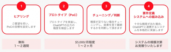 次に、プロトタイプを実装し、ChatGPTによる出力の精度を検証、及びチューニングします。この検証期間を経て、ChatGPTからの出力をお客様のサービスに十分活用可能との判断ができた上で、本格的に既存システムの改修、あるいは新規システムの開発を進めます。