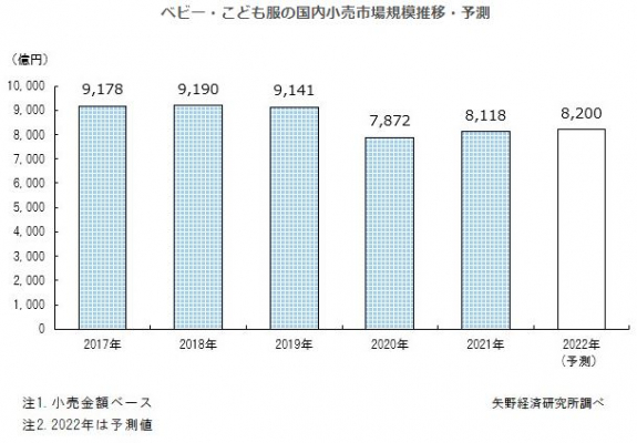 2022年の国内のベビー・こども服の小売市場規模は、前年比101.0%の8,200億円となり微増を予測する。
