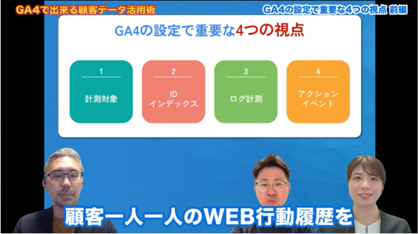 本動画シリーズはその第3弾として主にECサイト運用者向けに顧客1人ひとりのWeb行動履歴を見える化し、顧客データ活用に役立つGA4の設定方法について解説しております。