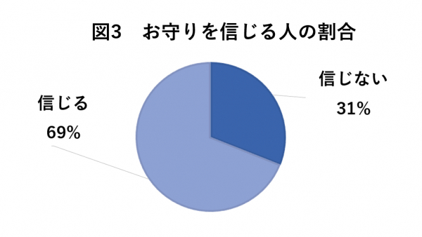 お守りの効果については、200人中「信じる」と回答した方は69%、「信じない」と回答した方は31%だということが明らかとなりました。