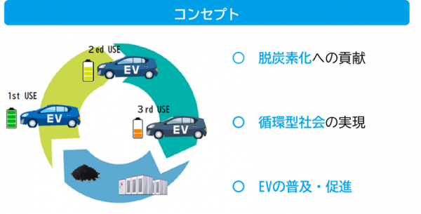 リユースEVは新車時と比較してバッテリー性能は低減しますが、用途や条件によっては十分に車両電源として利用することができます。EVの二次利用・三次利用の可能性を見極めることでEV利用の選択肢を広げ、脱炭素化と循環型社会の実現に貢献することを目的としています。
