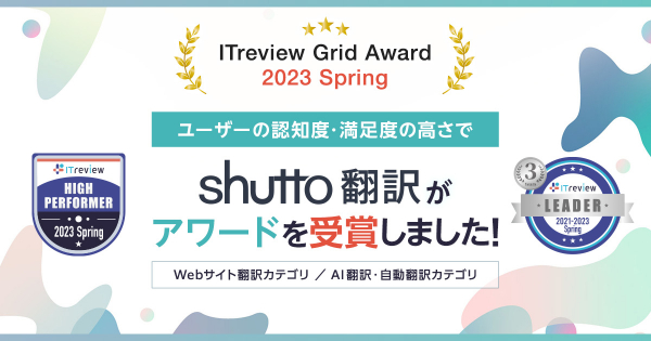この度、Webサイト翻訳ツール「shutto翻訳」は、アイティクラウド社主催の「ITreview Grid Award 2023 Spring」において、ユーザーから高い評価を受け、Webサイト翻訳カテゴリーでアワード「Leader」を、AI翻訳・自動翻訳(テキスト翻訳)ツールカテゴリーでアワード「High Performer」を受賞しました!Webサイト翻訳カテゴリーについては、17期連続の受賞となります!