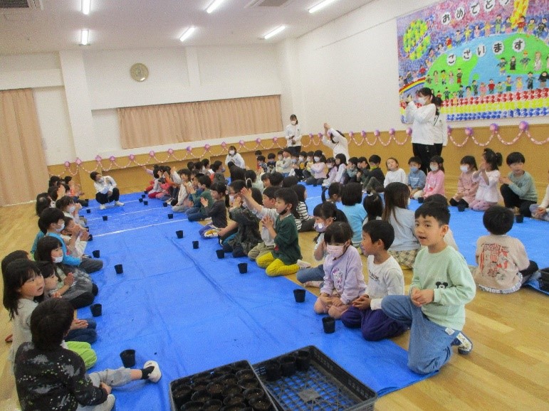 その後、5歳児と4歳児が一緒になってポットにヘチマの種を植えました。