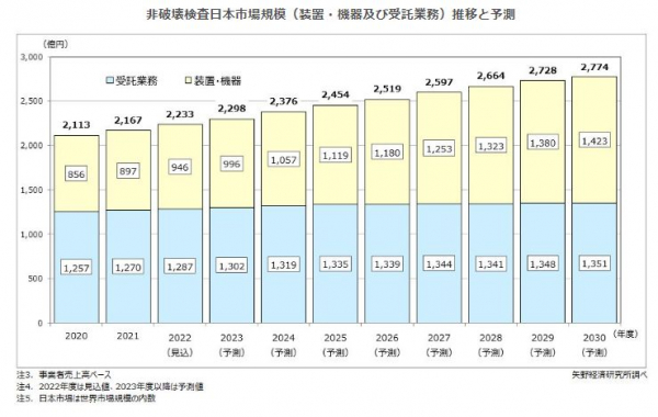 2030年度には、国内の装置・機器市場が1,423億円で、受託業務市場が1,351億円となり、合計した非破壊検査日本市場は2,774億円になると予測する。
