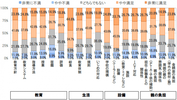 多くの項目で半数以上が「非常に満足」・「やや満足」と答える結果になりました。特に「給食(79.3%)」「設備(79.2%)」で評価が高く、保護者自身の子ども時代よりも進歩している点を評価しているようです。一方親の「非常に不満」「やや不満」の回答が多かったものが、「宿題(26.7%)」と「親の負担(PTA活動・子供の補助)(23.7%)」となりました。「宿題」においては中学受験を念頭に置いた場合に、レベルと量が合致しないこと、「親の負担」においてはPTA活動を大きな負担とする声が見受けられました。各観点別の要点は以下をご確認下さい。