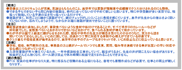 不満については学校ごとの取組の姿勢の違いや都内への人口集中ゆえの学校のキャパシティ不足などが挙げられます。