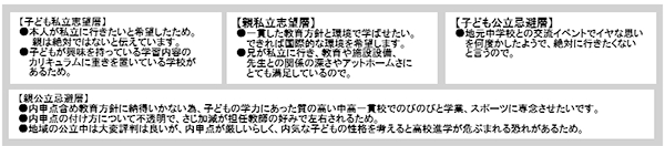 親子と私立中学志望・公立中学忌避を軸に4つのセグメントに分けることができました。中でも親の公立忌避の意見が多く、その理由の多くは内申点への懸念でした。