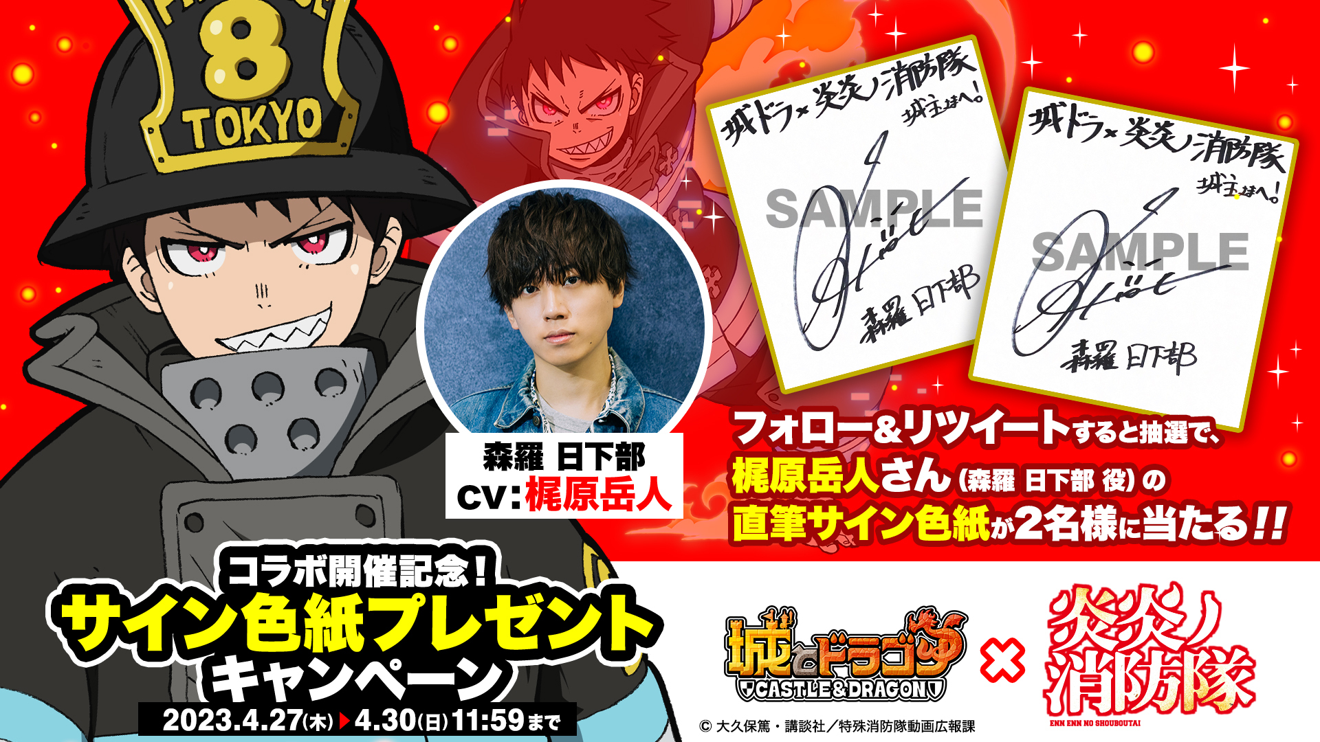 4月30日(日)より『城とドラゴン』にてTVアニメ『炎炎ノ消防隊』との初のコラボイベントを開催することが決定いたしました。コラボ限定キャラとして “森羅 日下部” が『城とドラゴン』に登場するほか、4月24日(月)からは「RTでアイテムGET!みんなで報酬グレードアップキャンペーン」、2023年4月27日(木)からは「コラボ開催記念!サイン色紙プレゼントキャンペーン」がスタートいたします。この機会をお見逃しなく!