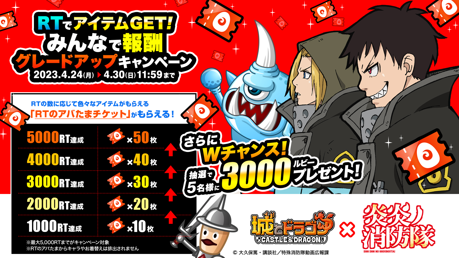コラボ開催を記念して、「RTでアイテムGET!みんなで報酬グレードアップキャンペーン」を実施します。『城とドラゴン』公式Twitterアカウント(@shirotodoragon)がつぶやいたキャンペーン対象ツイートの公式リツイート総数に応じて、いろいろなゲーム内アイテムが当たる「RTのアバたま」の専用チケット“RTのアバたまチケット”をユーザー全員にプレゼント!さらにWチャンスとして、リツイートされた方の中から抽選で5名様に、3000ルビーをお贈りします!