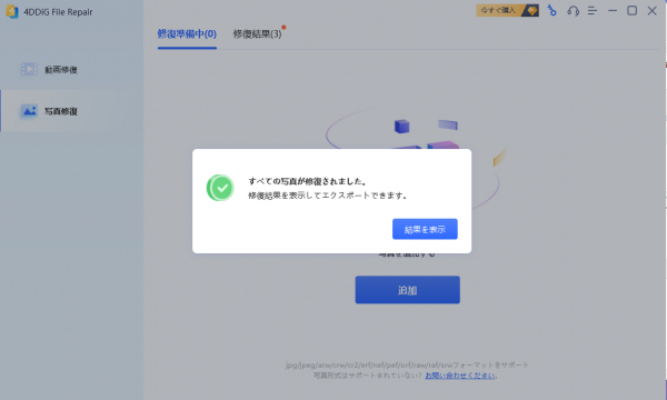 Step1:Windowsで4DDiG File Repairを立ち上げて、ホーム画面で「写真修復」メニューを選び、「追加」ボタンをクリックします。