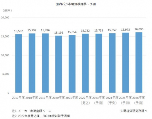こうした市場背景を考慮すると、パン市場は今後も微増で推移し、2026年度の国内パン市場規模は1兆6,090億円(メーカー出荷金額ベース)と1兆6,000億円台になると予測する。