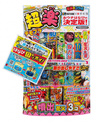 遊ぶ時に取り出しやすい手持ち花火に、パッケージ外付けで噴出花火3本と、更に固めてポイが付いた両社の3つの※実用新案を掛け合わせた商品