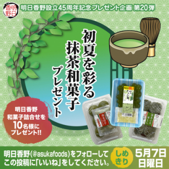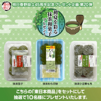 今回のキャンペーンでは明日香野東日本の抹茶系和菓子をセットにして合計10名様にプレゼントいたします。