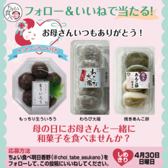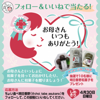 ぜひ、ご応募いただき、明日香野和菓子でお母さまに感謝の気持ちをお伝えください。