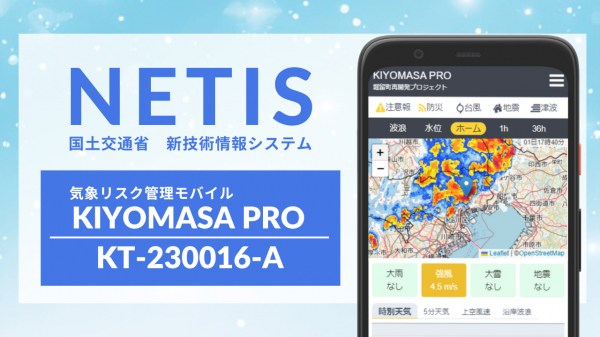 建設現場向け気象情報を提供する株式会社ライフビジネスウェザー(本社:東京都中央区、社長:鈴木俊成)は、2023年4月28日に気象リスク管理モバイル「KIYOMASA PRO」が、国土交通省の新技術情報提供システム「NETIS」※に登録されたことをお知らせ致します。