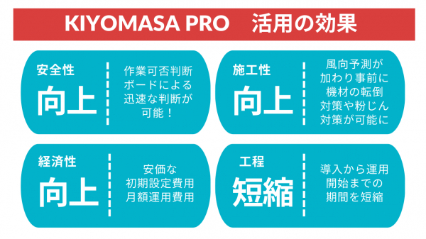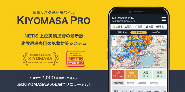 「KIYOMASA PRO」は、これまで7,000現場以上で活用された現場専用の気象サービスKIYOMASAをフルリニューアルしたシステムです。新たにNETISに登録されたことにより、国や地方自治体から発注された公共工事の現場において本システムを活用頂くことは、工事成績評定や総合評価落札方式での加点対象などの面でメリットになります。