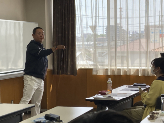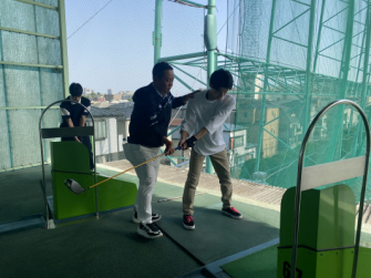 当社のイメージキャラクターであり、ゴルフギアに大変詳しい関雅史プロにもお越しいただき、ゴルフの基礎知識、ゴルフクラブの各パーツの名称や ゴルフクラブの握り方等、ゴルフに関する様々なレクチャーを受けました。また、ゴルフ練習場での実技研修では、スイング等のレッスンを受け、実際にゴルフにチャレンジすることでゴルフの楽しさを伝えていただきました。