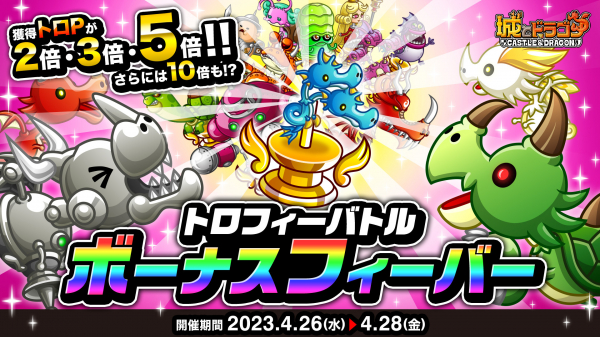 株式会社アソビズム(本社:東京都千代田区、代表取締役:大手智之)は、App Store・Google Playにて好評配信中の『城とドラゴン』で、「トロフィーバトル ボーナスフィーバー」を2023年4月26日(水)より開催いたします。