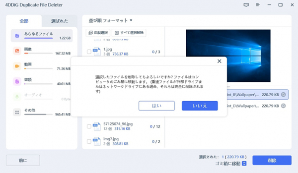Step3:「重複アイテムをスキャン」を実行し、完了です。スキャンが完了すると、画面に重複ファイルが表示され、右側のファイルの内容をプレビューして、不要なものを選択することができます。不要なファイルを選択したら、「削除」をクリックします。