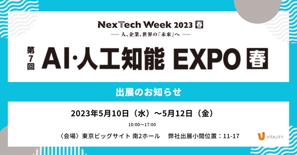 顧客のDX化を総合的に支援するバイタリフィ(東京都渋谷区、代表取締役:川勝潤治)は、2023年5月10日(水)~12日(金)に東京ビッグサイト南ホールで開催されるNexTech Week春 「第7回AI・人工知能EXPO春」に出展いたします。