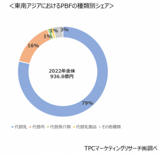 ◆東南アジア地域における市販用プラントベースフード(PBF)商品の市場は前年比12.1%増の936.8億円となった。このうち、約8割は豆乳などの代替乳が占める市場となっているものの、近年では代替肉など他の種類の市場規模が急伸し、市場全体におけるシェアを拡大している。