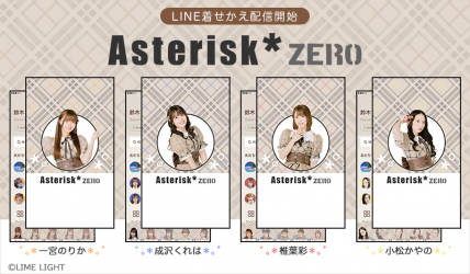4月17日、恵比寿リキッドルームにて待望の3rdワンマンライブを開催、大成功を収めた。「とにかくライブが楽しい!」のが特徴で、ついつい踊ってしまうそんな、いつ観ても最高のライブで会場を魅了する最強のポジティブユニット!椎葉彩の切れのあるダンス、成沢くれはの心地よく深みと存在感のある歌声、小松かやのの天性の可愛さ、一宮のりかのパワフルなパフォーマンスと、メンバーそれぞれの個性豊かなキャラクターが重なり、王道からロックまで器用に熟すステージパフォーマンスで唯一無二のアスタリワールドへと誘います。そんな「Asterisk*zero」のメンバーごとのLINE着せかえが4点一斉に配信開始!可愛さ満載のデザインです♪是非、LINE着せかえでも「Asterisk*zero」の世界観をお楽しみください。