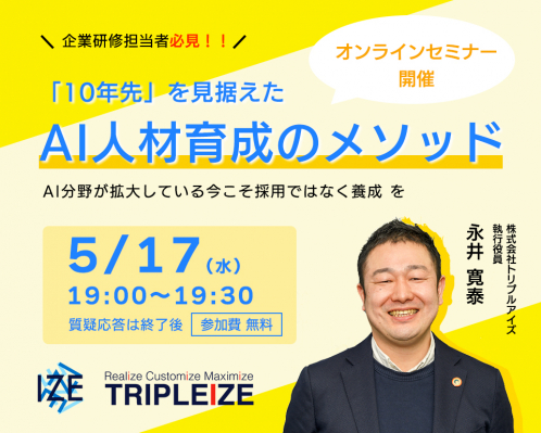 2023年5月17日(水)、株式会社トリプルアイズ(本社:東京都千代田区、代表取締役:山田 雄一郎、東京証券取引所グロース市場《証券コード:5026》、以下トリプルアイズ)は、「10年先を見据えたAI人材育成のメソッド」と題して、人材教育・研修担当者向けの無料ウェビナーを開催いたします。