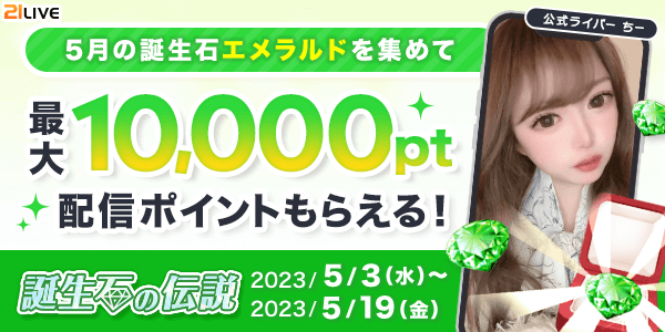株式会社エムアンドティーティー(本社:沖縄県北谷町、代表取締役:井藤 三知子)が運営するエンターテイメント・ライブ配信アプリ【21LIVE(ニーイチライブ)】URL: https://21.live では、5月3日(水)から5月19日(金)にかけて5月の誕生石アイテム・エメラルドの獲得数を競うライバーイベントを開催いたします。
