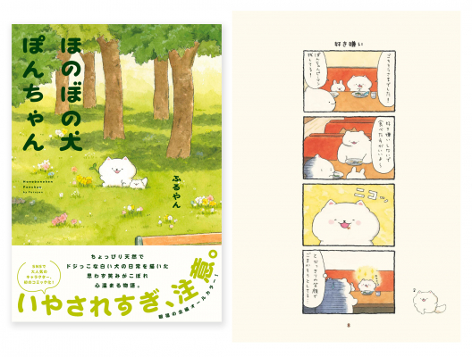「ほのぼの犬 ぽんちゃん」は、ちょっぴり天然な白い犬の男の子ぽんちゃんと、その仲間たちの漫画やイラストがSNSで人気のキャラクター。今回の書籍では、60ページを超える描き下ろし漫画やイラストを収録。デジタルではなくアナログで描かれた温かみのあるイラストや漫画に癒されること間違いなし!ぽんちゃんと一緒に笑ったり泣いたり癒されたり……ほっこりできる一冊です。
