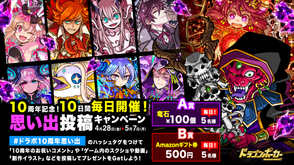 4月28日(金)より、『ドラゴンポーカー』サービス開始10周年を記念した「10周年記念!10日間毎日開催!思い出投稿キャンペーン」を開催いたします。期間中にお寄せいただいた投稿の中から抽選で竜石やギフトカードをプレゼント。ぜひ『ドラゴンポーカー』での思い出などをお聞かせください。