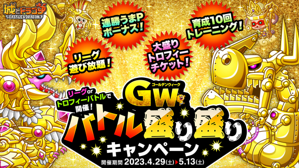 4月29日(土)より、「リーグ遊び放題」や「連勝うまPボーナス」「大盛りトロフィーチケットキャンペーン」「育成10回トレーニングバトル」など、クラスやキャラLvを上げやすくなる「GWバトル盛り盛りキャンペーン」を開催!また、同日よりスタートする「リーグ」では、「判定勝利」「判定敗北」で必ず勝敗が決まる「完全決着バトル」や、ランキング報酬として獲得できるアイテムが2倍になる「リーグランキング報酬倍増」キャンペーン、勝利した際のバトルフィールドの季節によって獲得できる“リーグP”が増加する「春夏秋冬バトル」なども同時開催いたします。GWも城ドラを楽しみましょう!