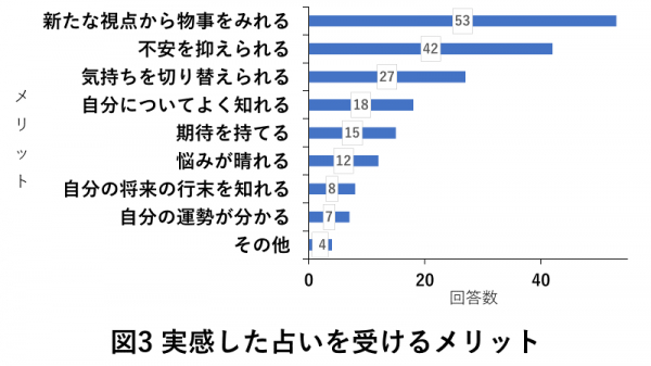 実際に占いを受けて体感したメリットについて調査した結果、「新たな視点から物事をみれる」を選択された方が最も多くみられました。