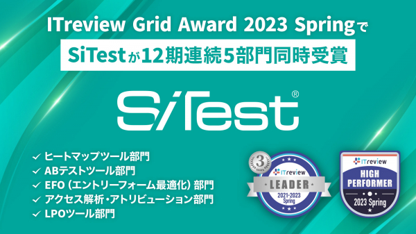 株式会社グラッドキューブ(本社:大阪市中央区 代表取締役 CEO 金島 弘樹 以下:グラッドキューブ)が提供するウェブサイト解析・改善 SaaS 「 SiTest(サイテスト) 」は、アイティクラウド株式会社(本社:東京都港区、代表取締役社長 黒野 源太)運営の IT 製品レビュープラットフォーム 「 ITreview(アイティレビュー) 」において、2023年4月19日に発表された「 ITreview Grid Award 2023 Spring 」におけるマーケティングの計5部門で「 Leader / High Performer 」を受賞いたしました。
