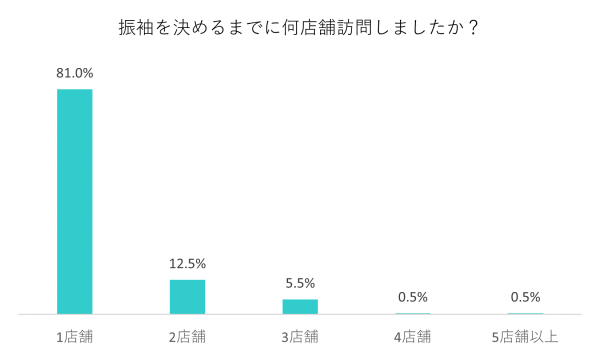 今回実施したアンケート調査によると、お気に入りの振袖がすぐに見つかった人は73%にのぼることが明らかになりました。また、振袖を決めるまでに何店舗訪問したかたずねたところ、「1店舗」と回答した人が最も多く81%、次いで「2店舗」12.5%、「3店舗」5.5%となり、大半の人が1店舗目で振袖を決めていることがわかりました。