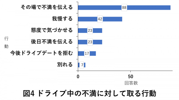 ドライブデート中、不満を感じた際に取る行動としては、「その場で不満を伝える」と回答した女性が多くみられました。