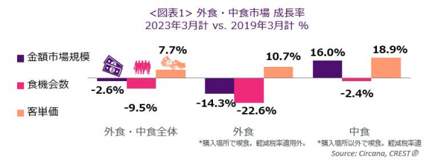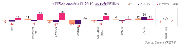 外食・中食市場の2023年3月は、売上2.6%減(2019年同月比)