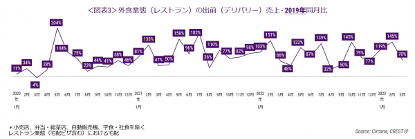 外食業態計(レストラン計)の出前(デリバリー)売上2019年同月比をみると(図表3)、プラス成長が続いています。デリバリー増加のピークは2020年5月の204%増ですが、その後も2ケタ増が続いています。2023年3月は同70%増でした。