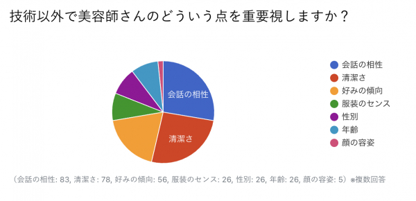 以上の結果から、技術以外で美容師さんを重要視する点は、清潔さを基本として、会話や好みの相性を重要視する人が多いことが分かりました。