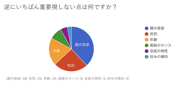 重要視しない点については、1位が「顔の容姿」(38%)、2位が「性別」(25%)、3位が「年齢」(20%)という結果でした。
