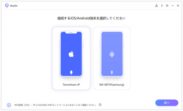 手順1:iAnyGoを起動し、お使いのデバイ(iPhone/Android)をUSBケーブルで、またはコンピュータを同じWi-Fiに接続します。お使いのデバイ(iPhone/Android)を選択し、デバイスのロックを解除した後「開始」ボタンをクリックして開始します。