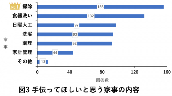 掃除といってもお風呂掃除やトイレ掃除、掃除機がけなどさまざまですが、食器洗いや日曜大工を含め肉体的疲労のある家事を手伝って欲しいと考える傾向にあるようです。
