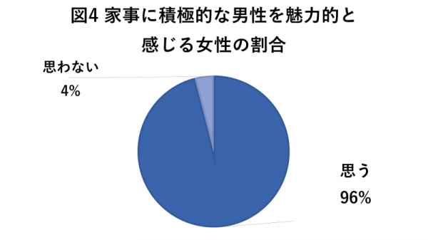 実際に自ら進んで家事を行う男性に対しては、魅力的と感じる女性が96%、魅力的と思わない女性は4%あげられていました。