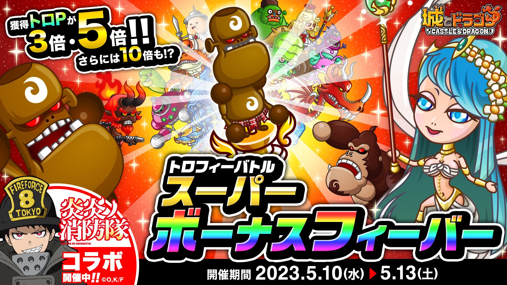 上記期間中、すべての「トロフィーバトル」を対象に、獲得“トロP”に倍率がかかるボーナスバトルが必ず発生します。バトルの勝敗に関係なく“3倍/5倍/10倍”のいずれかの倍率で“トロP”が増加します。